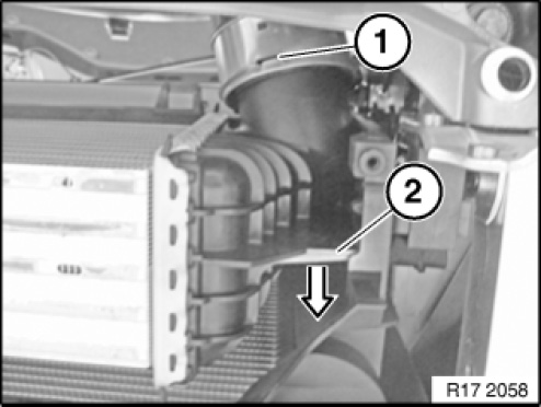Unlock right charge air duct (1) on charge air cooler and detach.