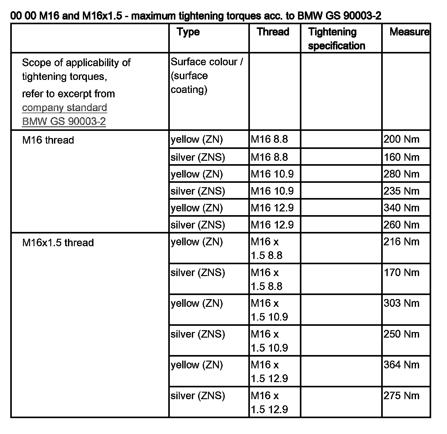 00 00 ... M16 and M16x1.5 - Maximum Tightening Torques Acc. to BMW GS 90003-2