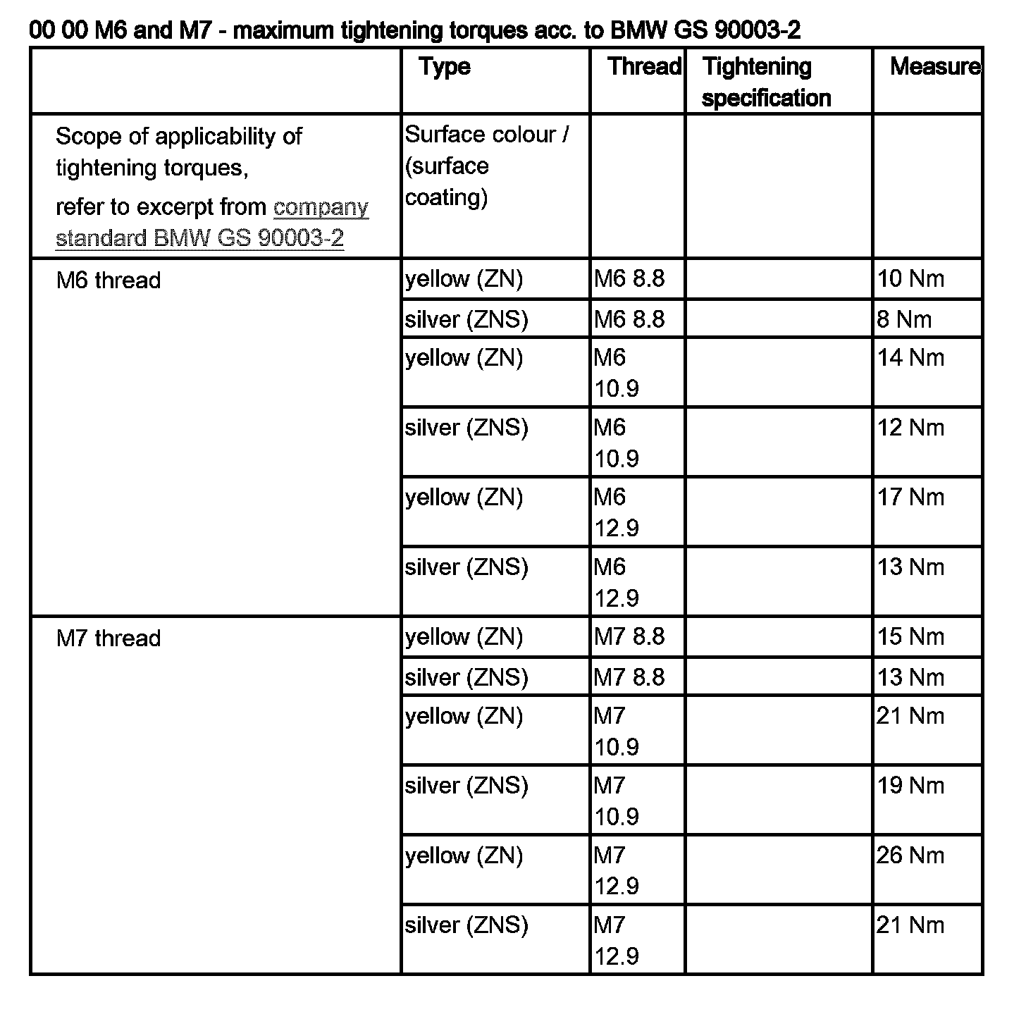 00 00 ... M6 and M7 - Maximum Tightening Torques Acc. to BMW GS 90003-2