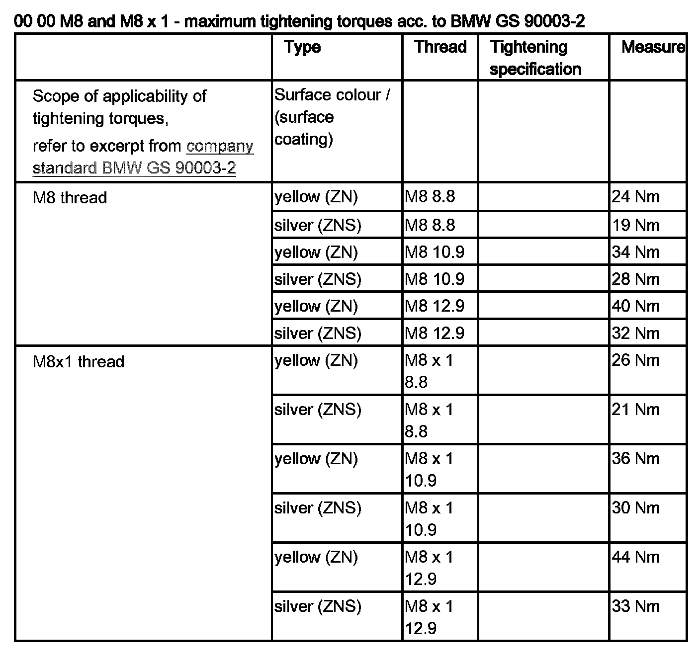 00 00 ... M8 and M8 x 1 - Maximum Tightening Torques Acc. to BMW GS 90003-2