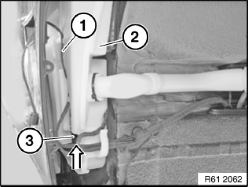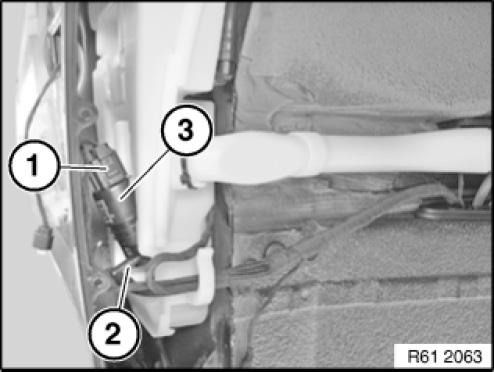 Detach washer fluid line (2) from windscreen washer pump (3).