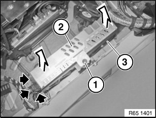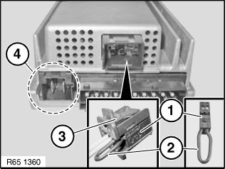 Install cable jumper consisting of plug insert (1) (BMW Parts Service 6901844) and wire jumper (2) in connector (3).