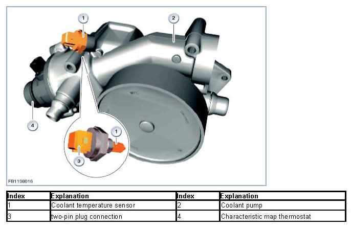 The characteristic map thermostat is also attached to the housing of the coolant pump.