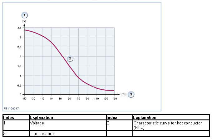 The electrical voltage at the resistor is dependent on the coolant temperature. There is a table stored in the Digital Engine Electronics (DME) that specifies the associated temperature for each voltage value. This compensates for the non-linear relationship between electrical voltage and temperature.