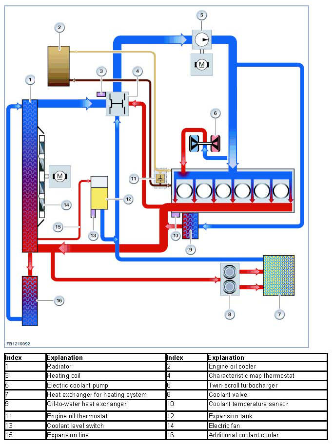 On the basis of the above signals, the Digital Engine Electronics (DME) calculates the optimal coolant temperature for each situation. The coolant temperature is influenced by specific heating of the wax element in the characteristic map thermostat as well as requirement-oriented activation of the electric fan. At full load, low coolant temperatures improves the cylinder filling. Furthermore, a low coolant temperature reduces the risk of the engine knocking. This can be a positive influence on the power output and torque.