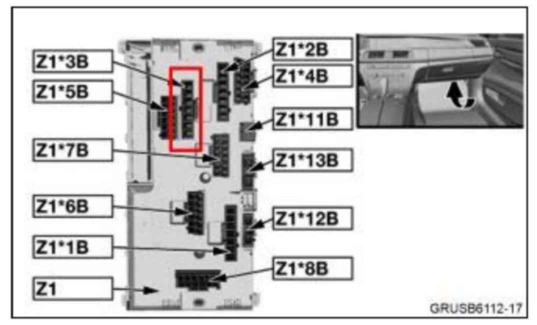 Connector Z1*3B at the (Z1) front power distribution box in the passenger compartment is loose (the 7-pin connector is not fully seated into the power distribution box).