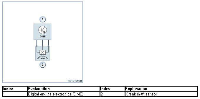 It is therefore not possible to define precise control limits. The engine speed is measured at the increment wheel assisted by the crankshaft sensor. The operational smoothness of the engine (misfire detection) is also monitored in addition to engine speed recording. In order to detect misfiring, the increment wheel in the Digital Motor Electronics (DME) is divided into segments based on the firing interval (between 2 ignition processes). The period duration of each segment is measured in the Digital Motor Electronics (DME) and statistically evaluated. The maximum permissible values for irregular operation are stored (as function of engine speed, load and coolant temperature) for each mapped value. If these values are exceeded for a specific number of combustion cycles, a fault entry is stored for each faulty cylinder detected.