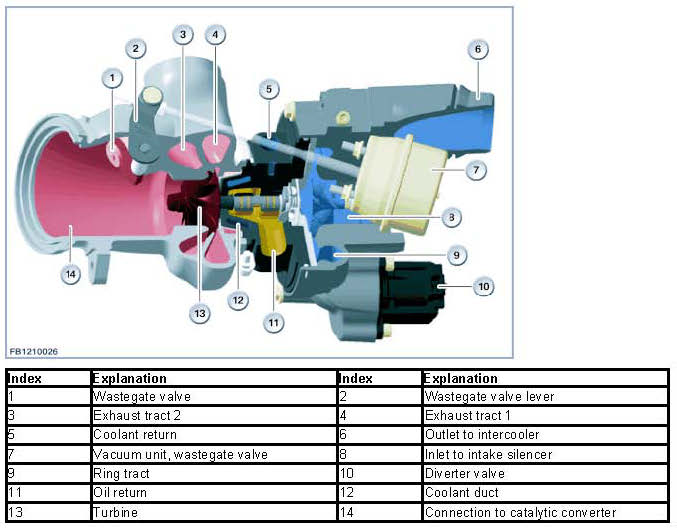 The turbine is only rarely exposed to constant exhaust-gas pressure. At low engine speeds the exhaust gases arrive as pulsating pressure waves. This pulsation produces brief spikes in the pressure ratio at the turbine. Because higher pressures are accompanied by a simultaneously rise in operating efficiency, the pulsation enhances the effective supercharging pressure to increase the N55 engine's torque generation. The benefits are particularly pronounced at low engine speeds. To prevent interaction between individual cylinders during gas exchange processes, the exhaust gases from cylinders 1-3 (bank 1) and cylinders 4-6 (bank 2) are conducted to separate, individual down pipes. The respective exhaust-gas streams remain separated within the turbocharger as they proceed through the exhaust tubes and onto the turbine in a spiral flow path (scrolls). This design ensures optimal exploitation of the pulsation to generate boost pressure.