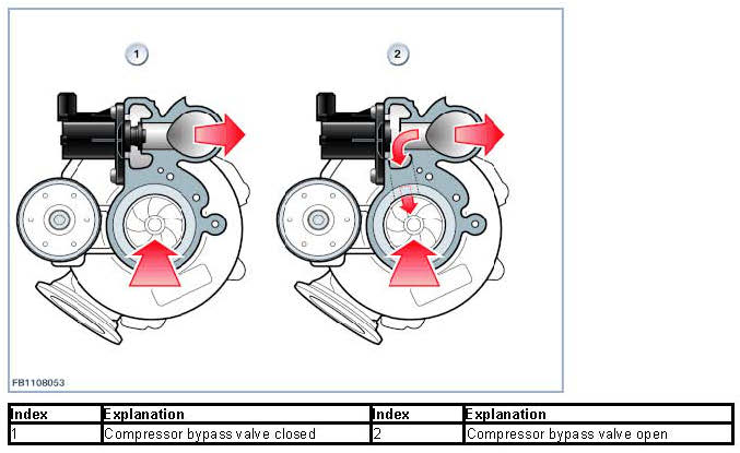 The compressor bypass valve opens to prevent intense oscillations in the impeller when the throttle valve is suddenly closed (for instance, during gear changes). The sets up a flow around the twin-scroll turbocharger. The compressor bypass valve prevents air from pulsating against the closed throttle valve.