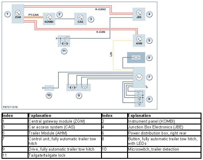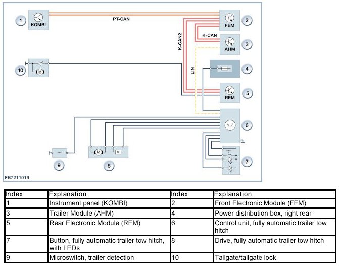 The vehicle can be ordered with a fully automatic trailer tow hitch as optional equipment. The fully automatic trailer tow hitch is operated using a button in the luggage compartment. The system has a control unit with LIN bus connection to the trailer module (AHM). The control unit for the fully automatic trailer tow hitch reports faults to the trailer module (AHM). The faults are stored in the trailer module. If necessary, a Check Control message is generated and displayed in the instrument cluster.