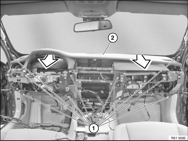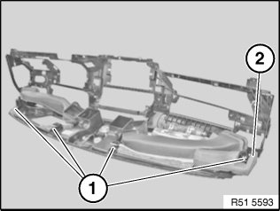 Make sure guides (1) on instrument panel trim (2) are correctly seated in respective mountings.