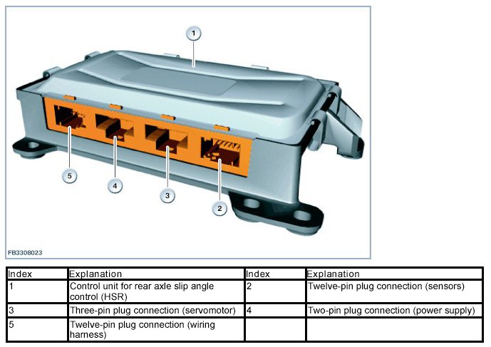 The control unit for the rear axle slip angle control (HSR) is in the luggage compartment well. The HSR control unit activates the servomotor in the actuator of the rear axle slip angle control. A temperature sensor in the HSR control unit monitors the output stage for the servomotor.