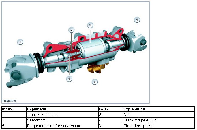 The electromechanical actuator consists of a servomotor that moves both track rods via a spindle gear drive. The track rods are connected to the track-rod arms. The actuator is configured for a maximum lifting movement of 8 mm, which leads to an angle of maximum 3° on the wheel. The spindle gear drive of the rear-wheel steering is designed as self-inhibiting. Following a system failure, the vehicle has the same characteristics as if designed without rear-wheel steering.