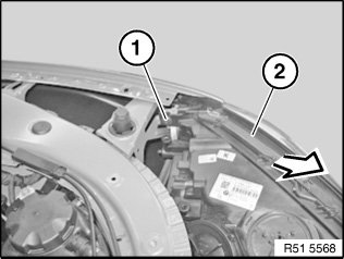 Feed out deformation element complete with headlights (2) and lock support in direction of arrow and set down safely.