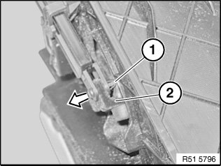 Release locking pin (1) and press out of glovebox guide (2) in direction of arrow.
