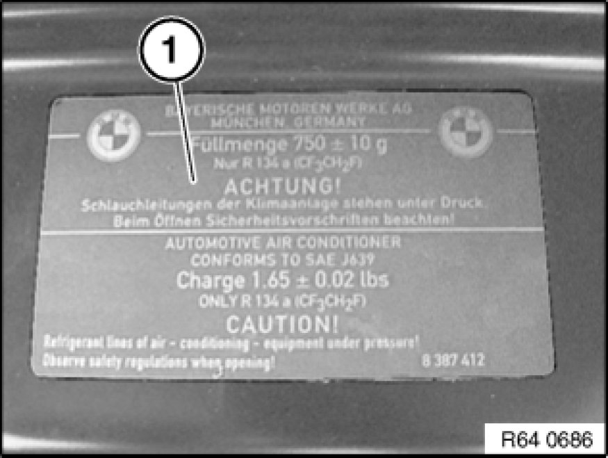 Information on the required refrigerant fill quantity for the entire A/C system is contained on the rating plate (1) in the engine compartment.