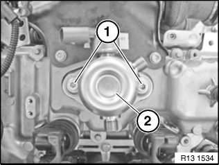 Slightly slacken screws (1) of high pressure pump (2). If the high pressure pump is forced out, the engine will have to be turned to bring the camshafts to a different position.