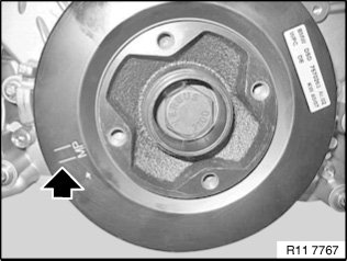 Rotate engine at central bolt through 90° in direction of engine rotation.