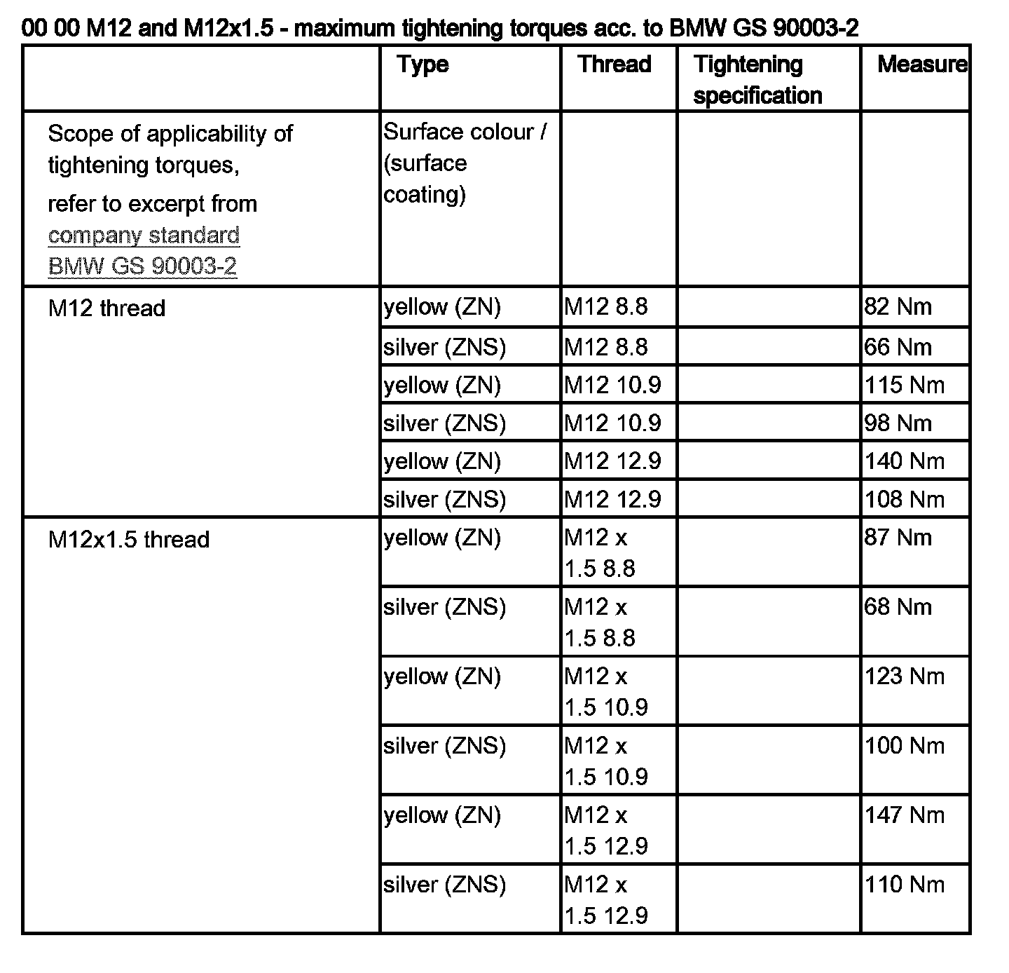 00 00 ... M12 and M12x1.5 - Maximum Tightening Torques Acc. to BMW GS 90003-2