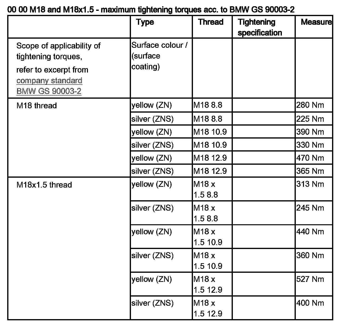 00 00 ... M18 and M18x1.5 - Maximum Tightening Torques Acc. to BMW GS 90003-2