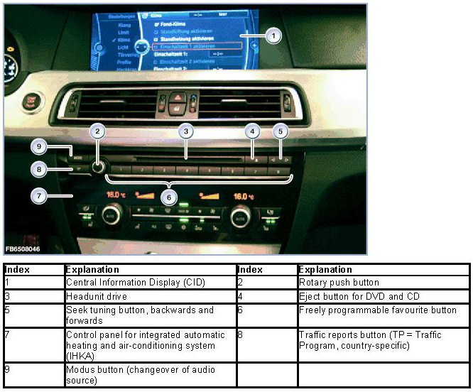 The headunit is the central control unit for the listed applications. For the purposes of picture signal transmission, the headunit is linked to the Central Information Display (CID). The headunit is also connected to the controller (CON). The controller (CON) is the control panel of the central information display (CID).