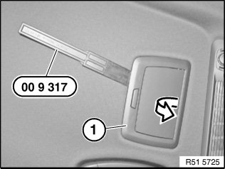 Carefully lever out make-up mirror (1) with special tool 00 9 317 in direction of arrow.