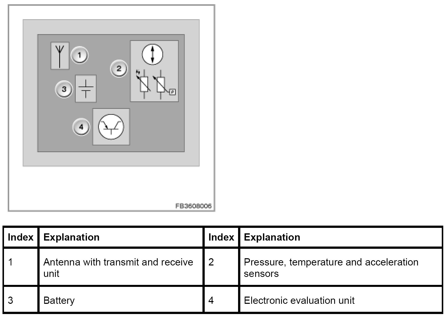 The tyre pressure monitor is a system for monitoring the tyre pressure while the vehicle is being driven. It is offered exclusively in the USA (legal requirement) and as an optional extra in Canada. At the request of the RDC control module (in cycles of 54 seconds), a message is queried via the RDC transmitters (125 kHz) by each wheel electronics system. The message is then sent across a high-frequency transmission path (433 MHz) to the RDC antenna.