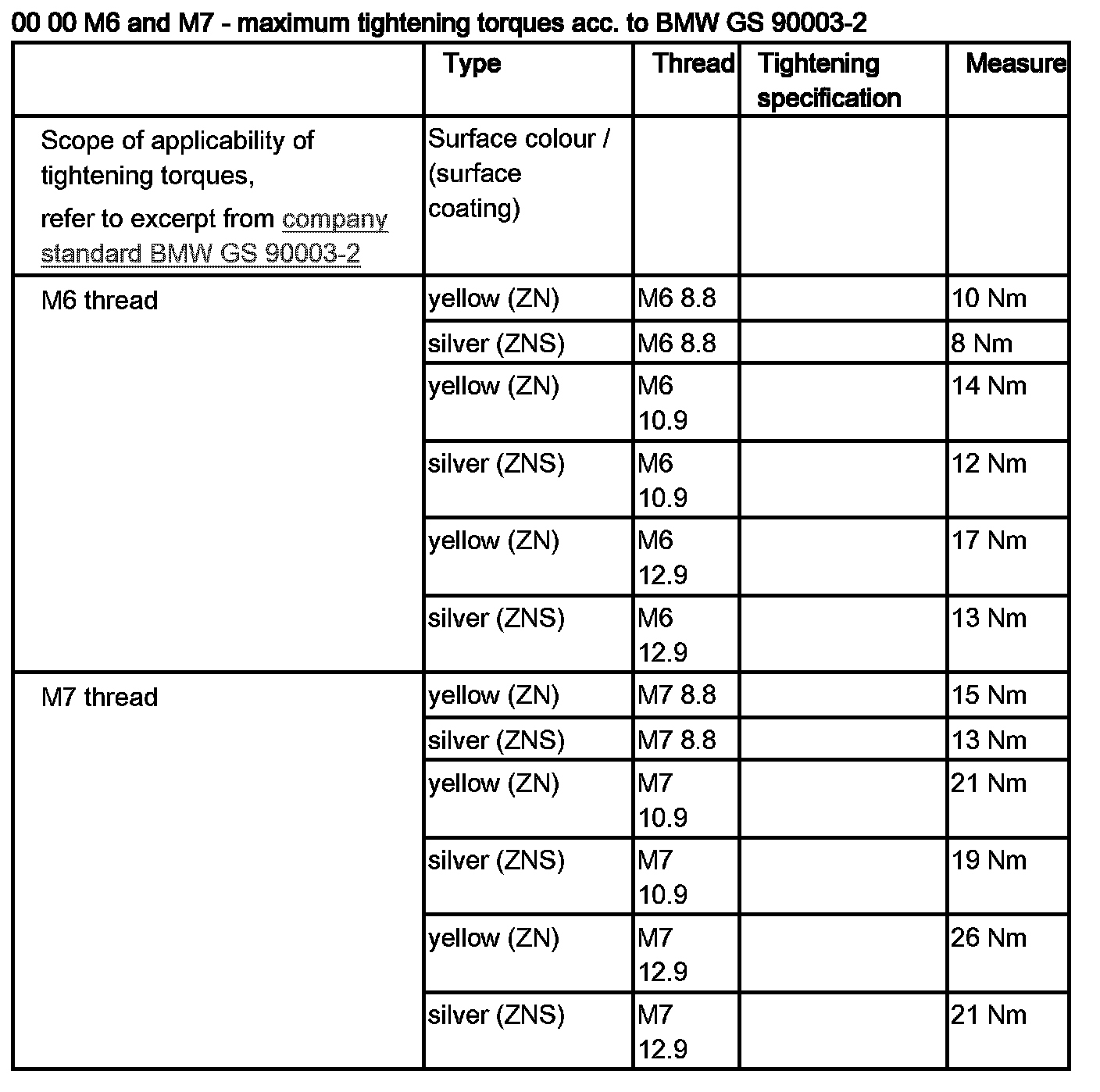 00 00 ... M6 and M7 - Maximum Tightening Torques Acc. to BMW GS 90003-2