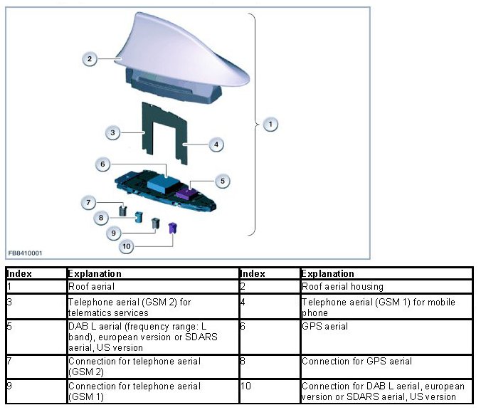 Within the scope of certain optional equipment, further additional aerials which are not for the telephone or telematics may be installed in the roof-mounted aerial (e. g. Digital Audio Broadcasting, Satellite Digital Audio Radio Service).