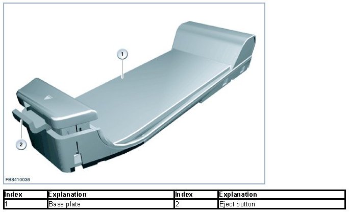 The base plate for mounting the mobile phone via the snap-in adapter is located in the centre armrest (with the optional equipment SA6NF extended connection of the music players in the mobile phone). Depending on the mobile phone used, a special snap-in adapter may be required. The snap-in adapter inserted into the base plate instead of the storage tray.