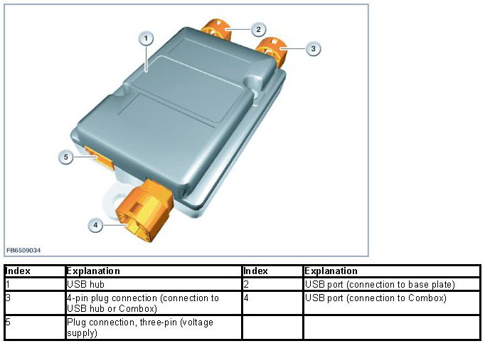 The USB hub contains an active USB signal amplifier. The USB hub has 2 inputs and 1 output for USB. The USB signal amplifier compensates for a power loss resulting from a cable extension of the USB connection. The USB hub is therefore only installed in vehicles where long cable lengths are used.