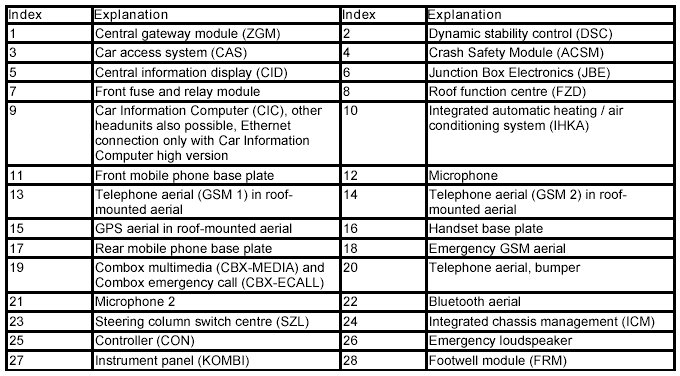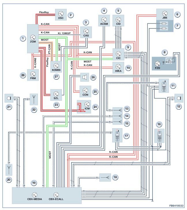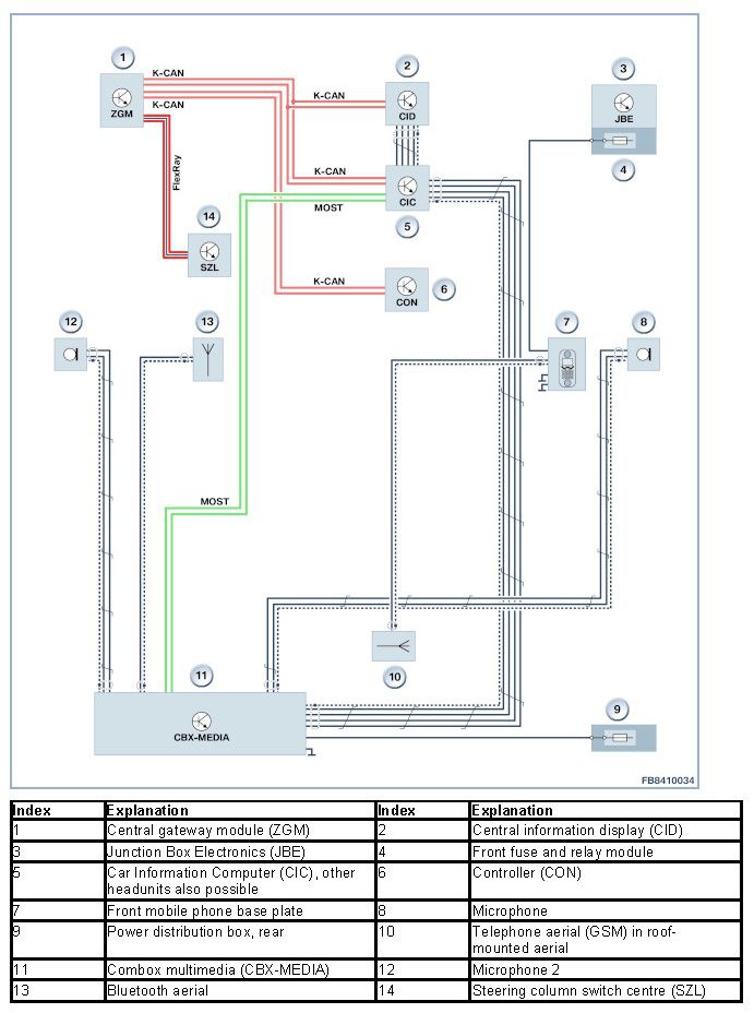 The Combox multimedia (CBX-MEDIA) is a MOST device and is supplied with voltage via terminal 30B. The Combox emergency call (CBX-ECALL) is a CAN control unit and is supplied with voltage via terminal 30F.