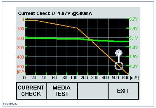 During the test, the load current of the USB connection is increased in steps, and the voltage is measured at the USB connection at the same time. These values are shown graphically on the display of the IMIB.