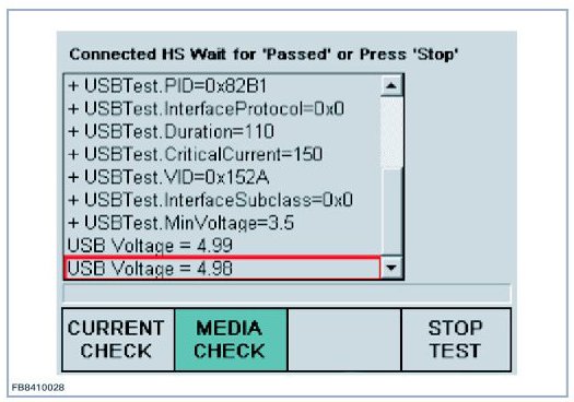 The Integrated Measurement Interface Box (IMIB) makes it possible to test the USB ports in the vehicle. Two tests are available for this purpose in the IMIB. The CURRENT CHECK is an electrical test of the USB interface, whereby only the vehicle-side power supply and the current level of the USB connection are tested. With the MEDIA TEST, various media files are made available via USB and are played back in the vehicle.