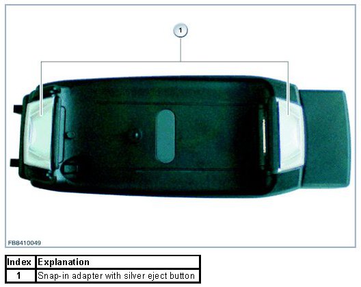 The Media snap-in adapter can be recognized by the silver eject button (see graphic). In addition, the text "VIDEO READY" or "MEDIA" is located on the underside. The audio playback is transferred analogously in this snap-in adapter.
