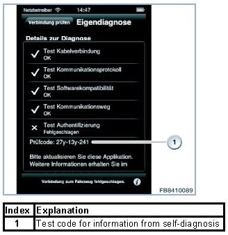 If the cause of the fault does not lie in the terminal device that has been used or the connection to the vehicle, a works order must be opened. The test code from the self-diagnosis must be documented on the works order by the Service Advisor. The test code is strictly necessary for passing all of the information to the workshop. It contains the basic information for performing a diagnosis without a terminal device. Successful diagnosis in the workshop and settlement in warranty cases are only possible if the test code is provided.