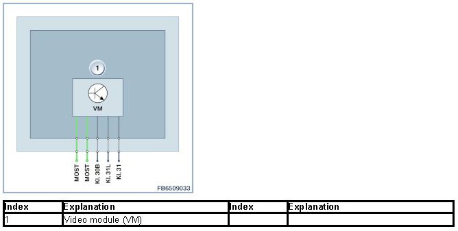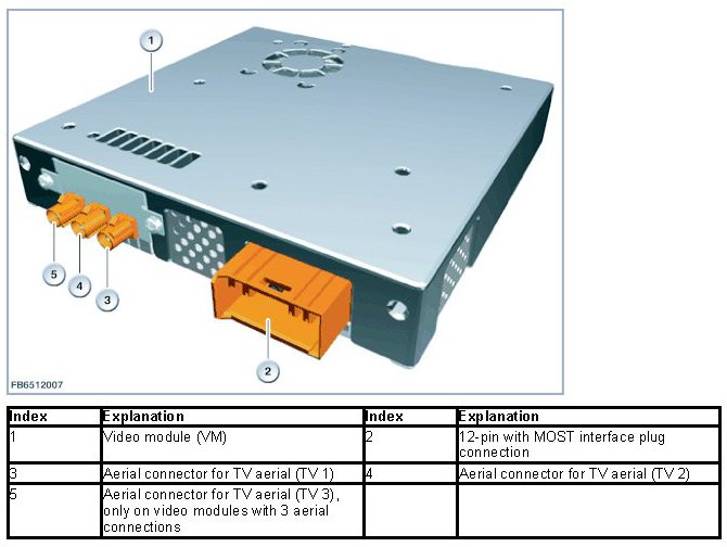 The video module (VM) is connected to the vehicle electrical system and the MOST via a 12-pin plug connection with a MOST interface.