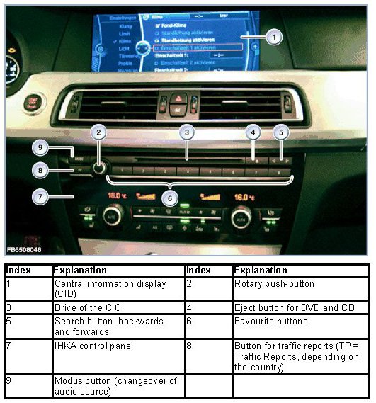 The operating unit for M-ASK-AUD with the 'favorites' buttons is not connected directly to the CIC. The operating facility is integrated in the control panel for the IHKA. The electrical connection is by means of a ribbon cable leading to the IHKA control unit. The IHKA sends the signals in messages on the K-CAN.