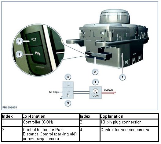 The selector keys are used now instead of pushing the controller for a longer period in a certain direction. A small switch block is electrically connected at the controller. Depending on the options fitted, the switch block contains the controls for the Park Distance Control (PDC = parking aid) as well as for the bumper camera. The signals are placed by the controller (CON) on the K-CAN.