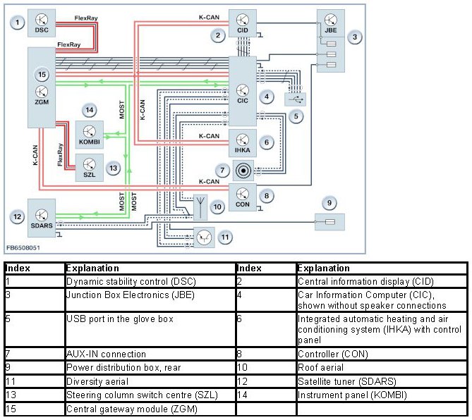 In the rear passenger compartment, there are 2 folding rear monitors, each with 800 x 480 pixel resolution as well as an infrared transmitter unit (SA6FG or SA6FH). The rear monitors are integrated in the backrests of the front seats. On both versions, the control unit (RSE) is integrated for the first time in the MOST bus. The Car Information Computer (CIC) serves as the master control unit for the MOST bus. The rear monitors are also connected on the K-CAN.
