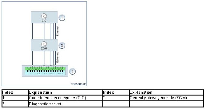 The diagnostic socket is connected to the CIC via Ethernet (5 lines). The central gateway module (ZGM) is located in between. The CIC is programmed via Ethernet.