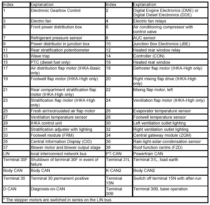 The flap motor is fitted with an integrated circuit. This circuit controls the coil of the flap motor. The circuit has bus- and diagnosis capabilities. After activation of the flap motor, the integrated circuit sends position feedback (actual position) to the control unit. The flap motors communicate across the LIN bus with the HKA control unit. The flap motors are switched in series on the LIN bus. Each flap motor is assigned a certain address. The address determines which function the flap motor assumes in the system network. For example, the footwell flap motor knows that messages are being addressed to it via this address (e.g. open flap). This address tells e.g. the IHKA control unit which flap motor has sent it a fault message.