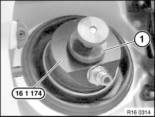 Using thumbwheel (1), clamp special tool 16 1 174 to fuel filler neck.