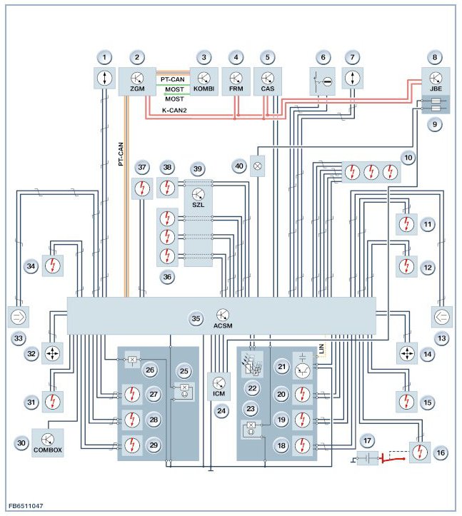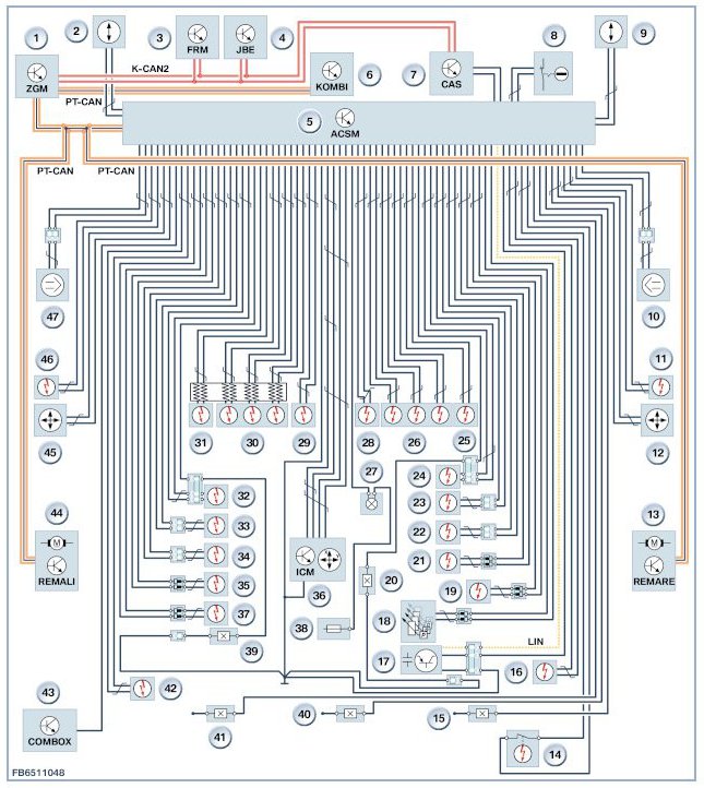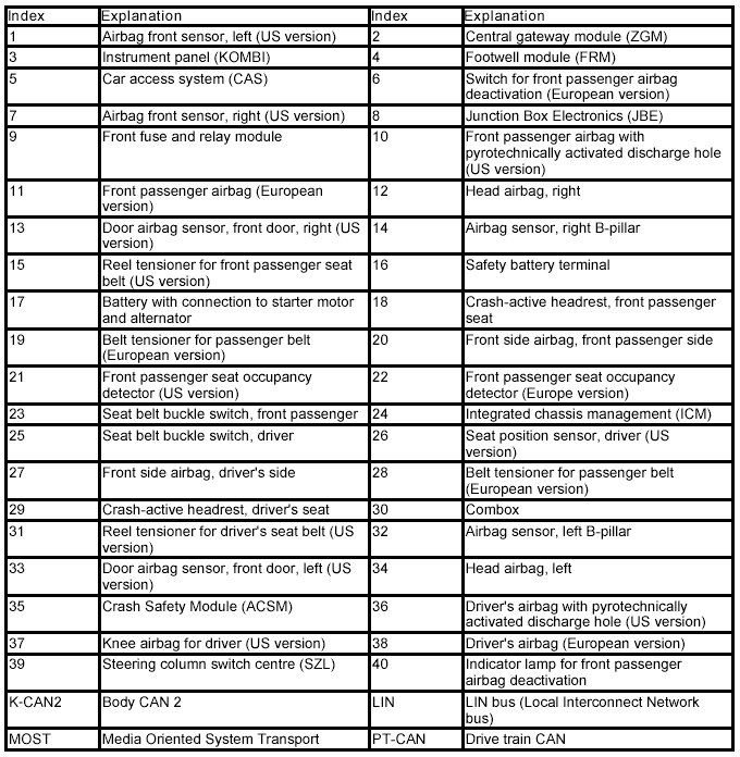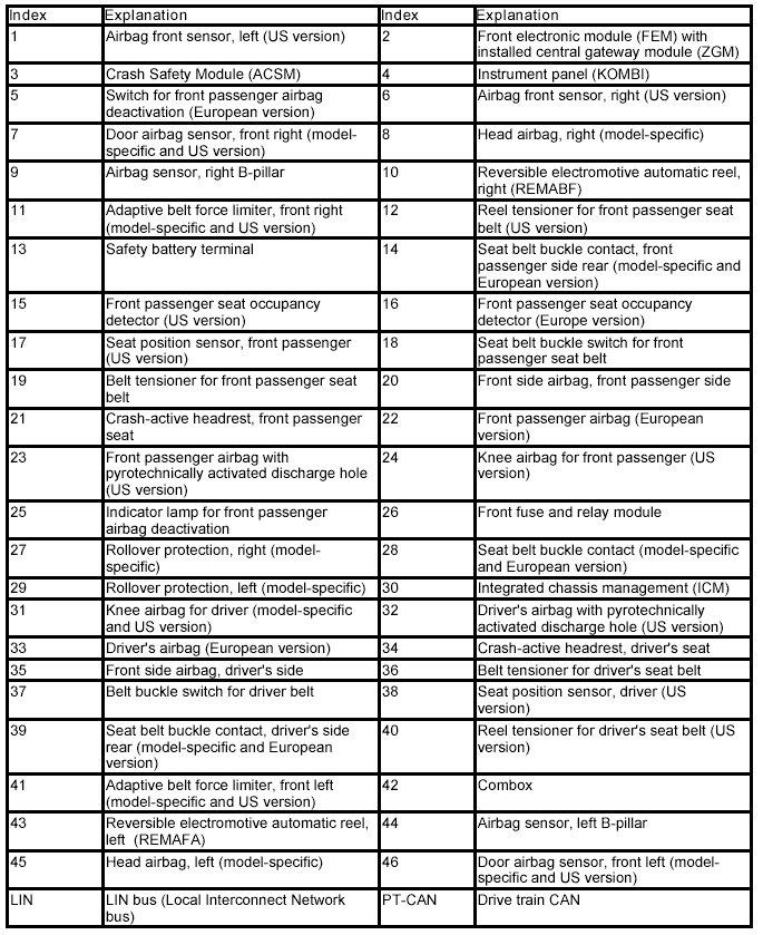 The Crash Safety Module (ACSM) transmits a message to other bus users when the restraint systems are triggered. Depending upon accident severity the responsible control units can carry out functions such as the following: