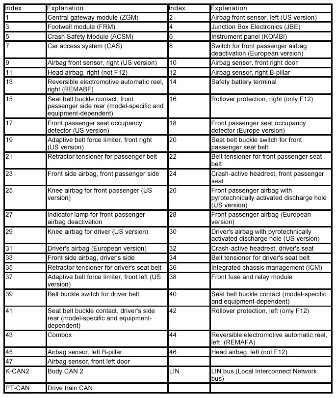 The following graphic illustrates the operating networks of the safety systems in the Europe and in the US versions using the example F25.