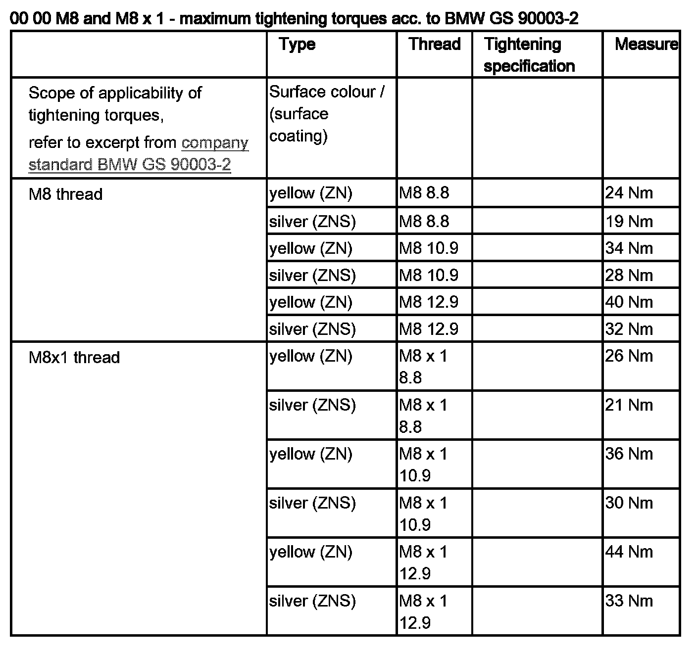 00 00 M8 and M8 x 1 - maximum tightening torques acc. to BMW GS 90003-2