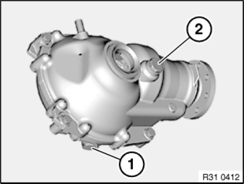 If necessary, top up the front axle differential oil to the lower edge of the opening for oil filler plug (1).
