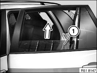 Move door window (1) until the mount stop (2) of the power window regulator can be operated via the recess (3) on the guide rails of the power window regulators (4).