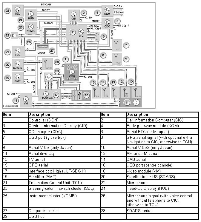 The diagnosis connector is connected to the D-CAN and via Ethernet to the CIC. The CIC is programmed with map data of the navigation as well as the audio database (Grace note) via Ethernet. The rest is programmed via the MOST direct access point.