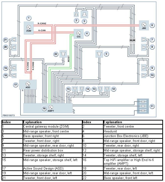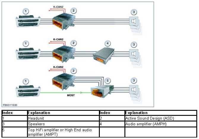 The Active Sound Design (ASD) is woken in the stereo system by the K-CAN2 (E89 K-CAN). The Active Sound Design (ASD) fuses the audio signals coming from the headunit with the vehicle-specific and engine-specific audio signal. At the same time, the Active Sound Design (ASD) functions as an audio amplifier in this system. The combined and amplified audio signals are transmitted to the relevant speakers by the Active Sound Design (ASD).